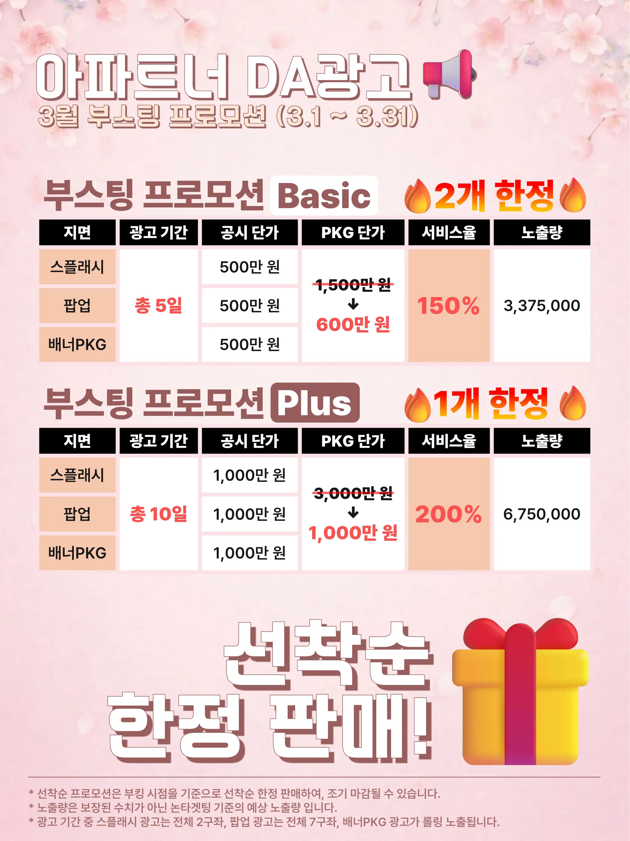 은 매월 한정 혜택으로 진행되는 아파트너 DA 광고 프로모션입니다. 월별 마케팅 시즌과 광고 수요에 맞춰 구성된 패키지로, 공식 단가 대비